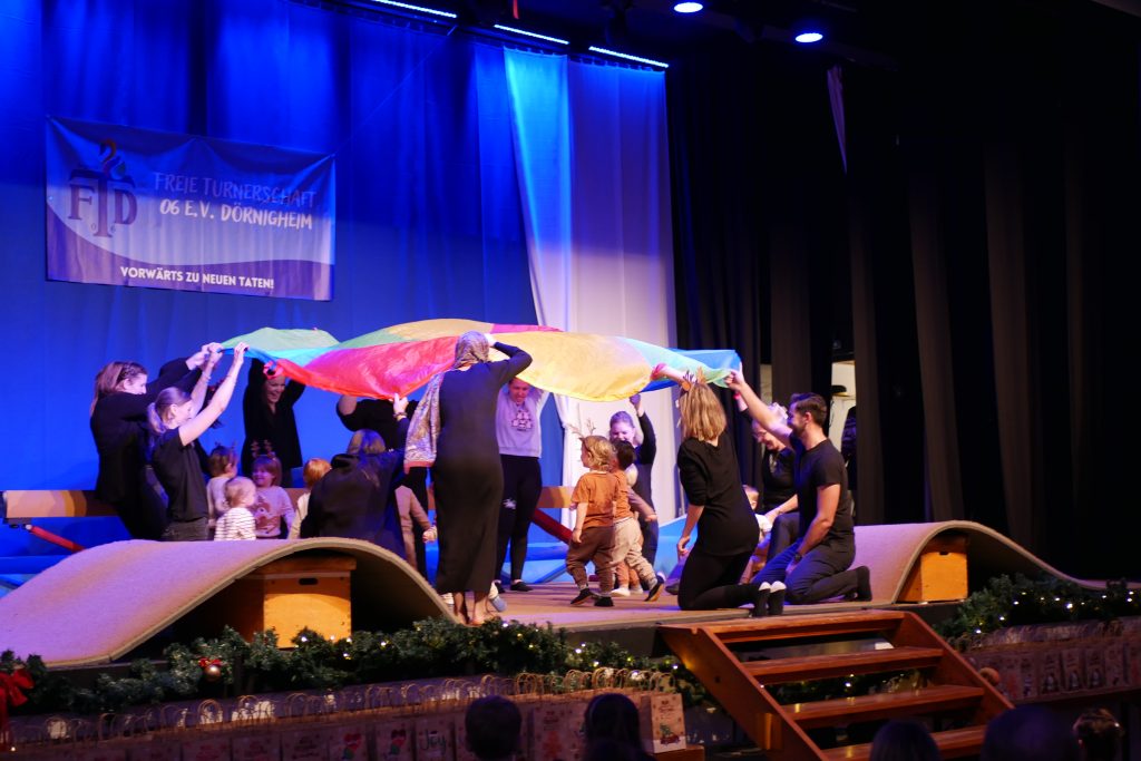 Zusammen werden zum Beispiel verschiedene Stationen aufgebaut, an denen Turnübungen gemacht werden. Trampoline, Seile, Ringe, Bänke und viel mehr sind dazu da, um spielerisch zu rennen, klettern, springen und balancieren. Das Sozialverhalten im Miteinander in einer Gruppe wird so ebenfalls erlernt. Damit werden die Kinder langsam an den Sport herangeführt.